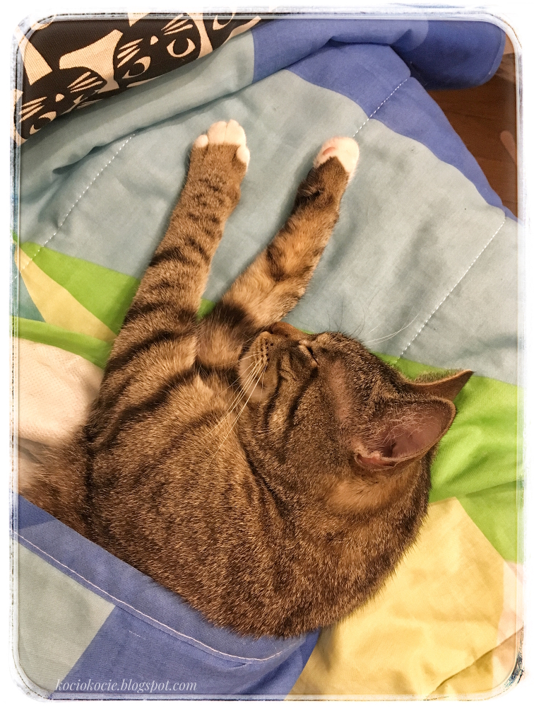 Chociaż Ksenia jest takim kotkiem, który w te cieplejsze dni też śpi przykryta :D A kiedy jest już za ciepło, to wylewa się spod przykrycia.